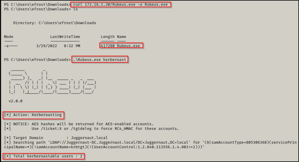 将 Rubeus.exe 下载到受害者机器上,然后使用以下命令成功地请求两个服务帐户的服务票据(TGS-REP HASHES):