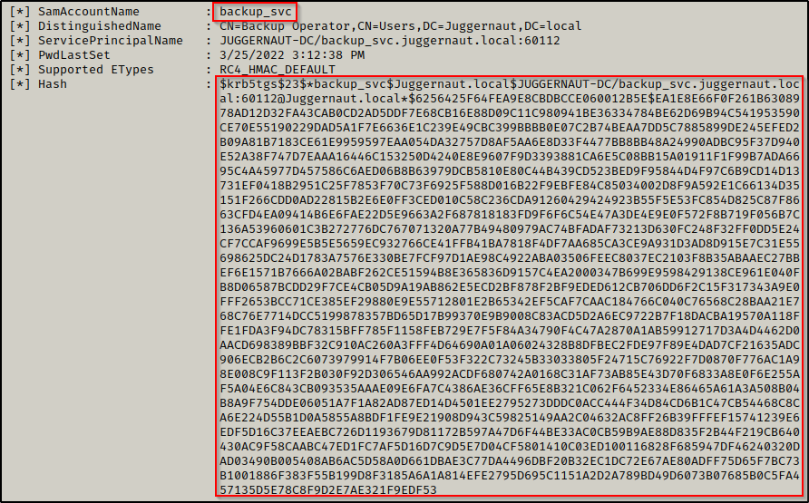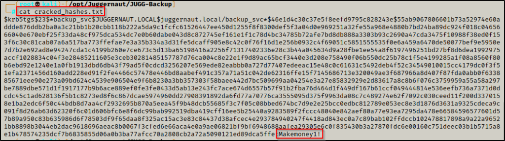 检查输出文件,我们发现破解了 backup_svc 帐户的哈希。