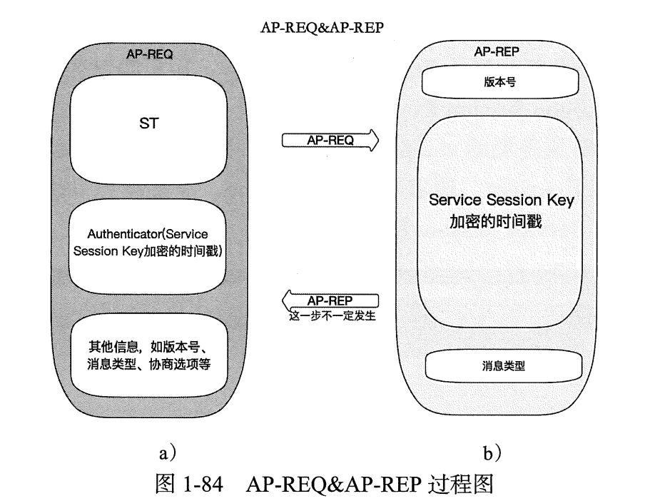 AP-REQ 请求:客户端接收到 KDC 的 TGS 回复后,通过缓存的 Logon Session Key 解密 enc_Service Session key 得到 Service Session Key,同时它也拿到了 ST。Serivce Session Key 和 ST 会被客户端缓存。客户端访问指定服务时,将发起 AP-REQ,该请求主要包含的信息如图 1-84a 所示。