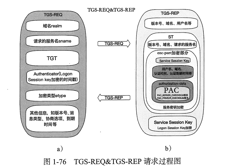 TGS-REQ 请求:客户端用上一步获得的 TGT 发起 TGS-REQ,向 KDC 购买针对指定服务的 ST,该请求主要包含的信息,如图 1-76a 所示。