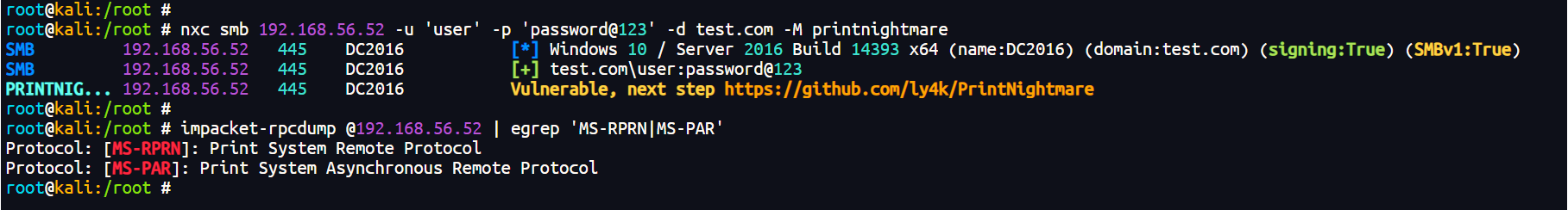 nxc smb 192.168.56.52 -u 'user' -p 'password@123' -d test.com -M printnightmare