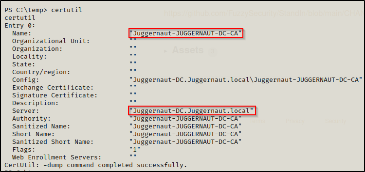 可以看到,DNSHostname 是 Juggernaut-DC.Juggernaut.local。同时,此搜索还显示了证书颁发机构是:Juggernaut-Juggernaut-DC-CA