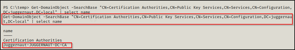 Get-DomainObject -SearchBase "CN=Certification Authorities,CN=Public Key Services,CN=Services,CN=Configuration,DC=juggernaut,DC=local" | select name