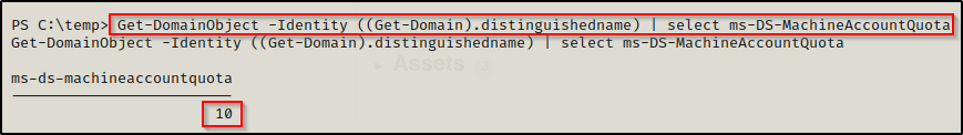 Get-DomainObject -Identity ((Get-Domain).distinguishedname) | select ms-DS-MachineAccountQuota