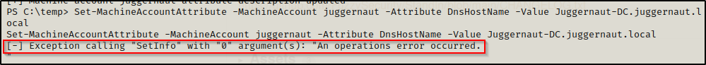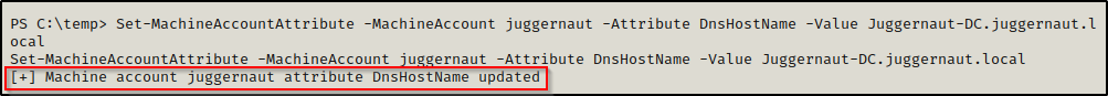 Set-MachineAccountAttribute -MachineAccount juggernaut -Attribute DnsHostName -Value "Juggernaut-DC.juggernaut.local"