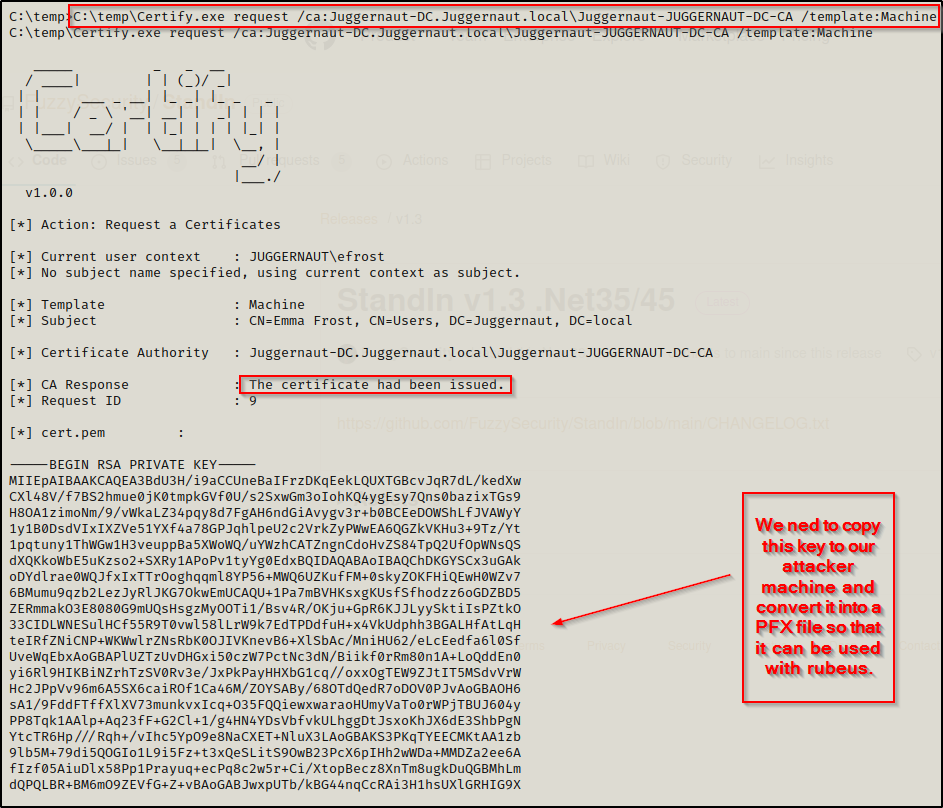 C:\temp\Certify.exe request /ca:Juggernaut-DC.Juggernaut.local\Juggernaut-JUGGERNAUT-DC-CA /template:Machine