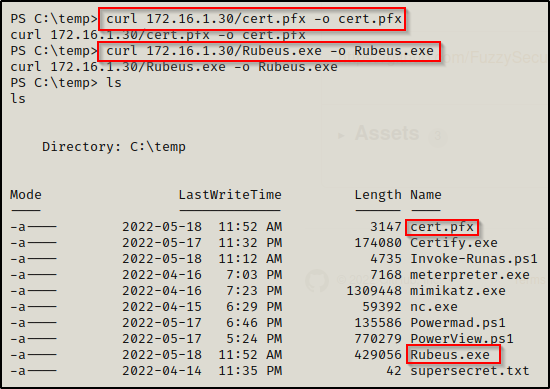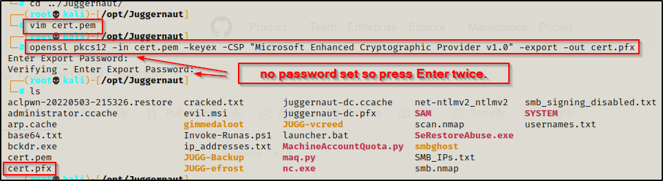 可以看到,我们成功申请到了证书,只不过还需要将其复制粘贴到一个 cert.pem 文件中。然后,使用 openssl 将证书转换为 PFX 格式,并将其与 rubeus.exe 一起发送回受害者。