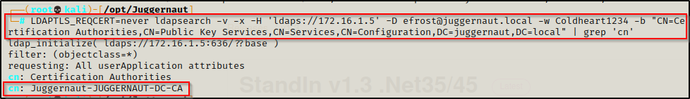 LDAPTLS_REQCERT=never ldapsearch -v -x -H 'ldaps://172.16.1.5' -D efrost@juggernaut.local -w Coldheart1234 -b "CN=Certification Authorities,CN=Public Key Services,CN=Services,CN=Configuration,DC=juggernaut,DC=local" | grep 'cn'