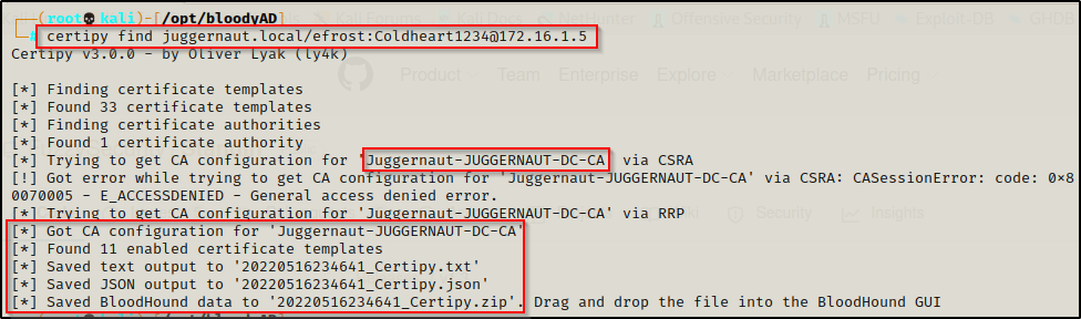 certipy find juggernaut.local/efrost:Coldheart1234@172.16.1.5