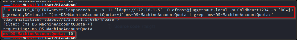 LDAPTLS_REQCERT=never ldapsearch -v -x -H 'ldaps://172.16.1.5' -D efrost@juggernaut.local -w Coldheart1234 -b "DC=juggernaut,DC=local" "(ms-DS-MachineAccountQuota=*)" ms-DS-MachineAccountQuota | grep 'ms-DS-MachineAccountQuota:'