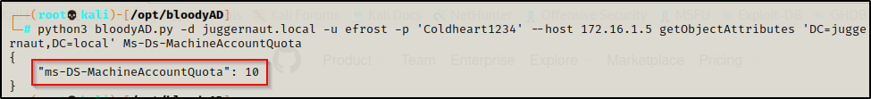 ldapsearch -v -x -H 'ldap://172.16.1.5' -D efrost@juggernaut.local -w Coldheart1234 -b "DC=juggernaut,DC=local" "(ms-DS-MachineAccountQuota=*)" ms-DS-MachineAccountQuota | grep 'ms-DS-MachineAccountQuota:'