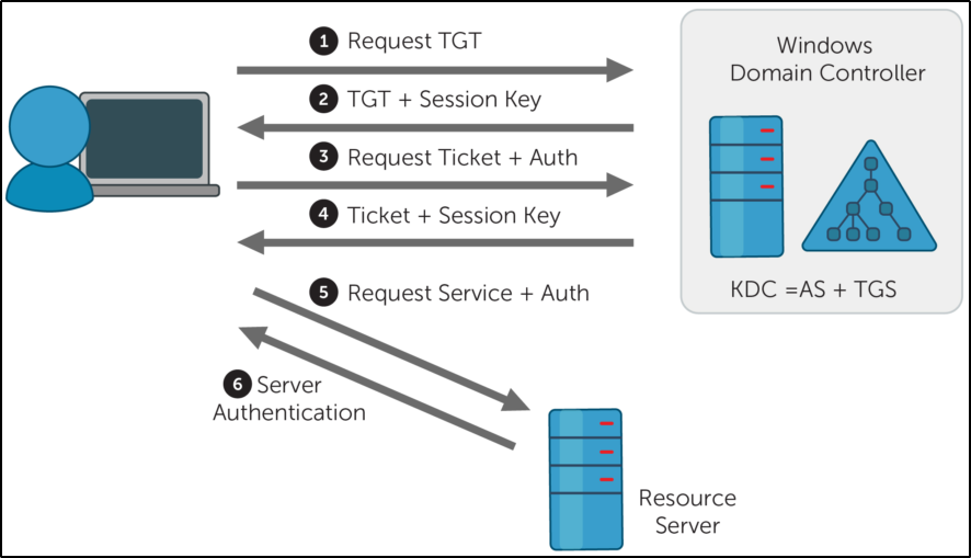 作为替代 NTLM 的一种手段,Kerberos 提供了一种安全的票据机制来验证网络用户和服务的身份。客户端可以凭借域账户密码向 KDC(即密钥分发中心,它提供身份验证和票据发放服务。)发起身份验证以申请票据授予票据(即 TGT),然后再使用 TGT 票据向 KDC 申请服务票据(即 ST),最后使用 ST 票据与所申请的服务进行身份验证并建立安全会话。