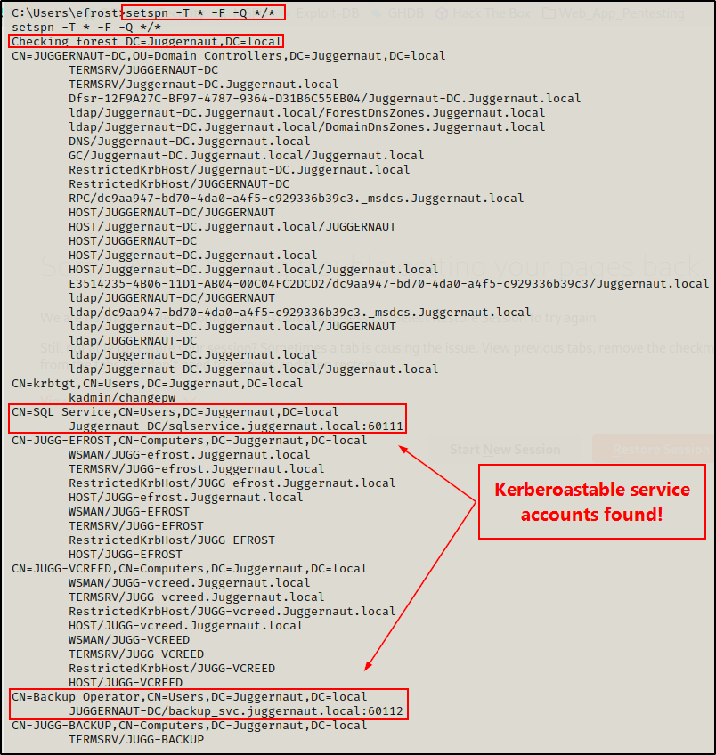 注:上面输出的信息中,主要有 以域控账户注册的 SPN、以域计算机账户注册的 SPN、以域用户账户注册的 SPN,而我们只关注以域用户账户注册的 SPN,即包含 CN=Users,DC=juggernaut,DC=local 的用户。
