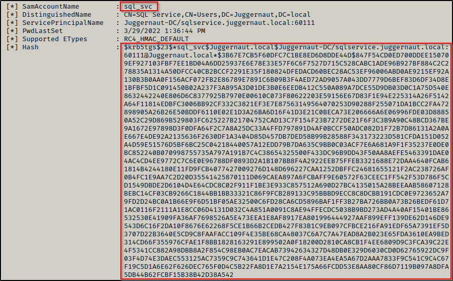 从上面输出中可以看到,该林仅包含一个域:juggernaut.local,并且还找到了两个可 kerberoasting 的服务帐户:sqlservice、backup_svc