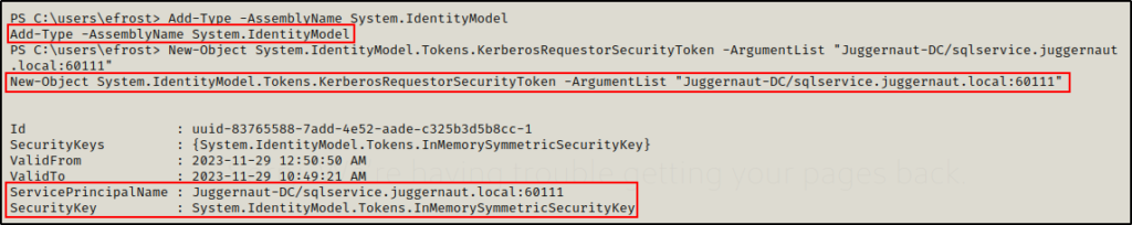 New-Object System.IdentityModel.Tokens.KerberosRequestorSecurityToken -ArgumentList "Juggernaut-DC/sqlservice.juggernaut.local:60111"