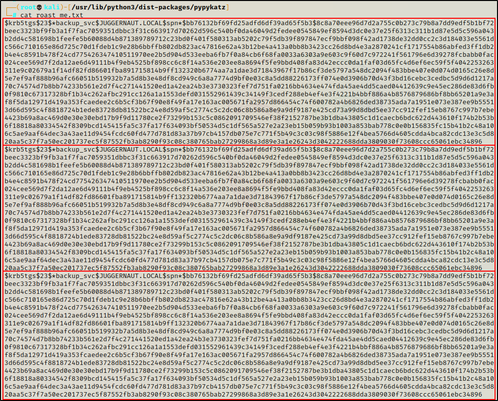 Amazing!使用 Hashcat + rockyou.txt 成功破解了其中一个哈希值,检查输出文件 cracked_hashes.txt,我们可以看到破解了 backup_svc 帐户的哈希!