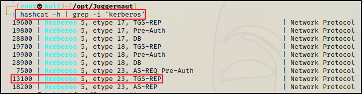 TGS-REP 哈希值类型有几种类型可供选择,这对应了 Kerberos 支持的几种的哈希算法。其中类型 23 对应着 RC4 哈希值($krb5tgs$23$),类型 18 对应着 AES 哈希( $krb5tgs$18$)。