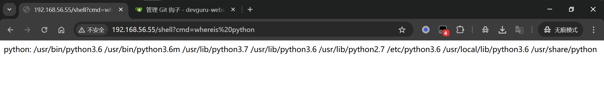 (2)然后访问该 shell 页面并给 cmd 参数传递想要执行的命令。如 http://192.168.56.55/shell?cmd=whereis%20python