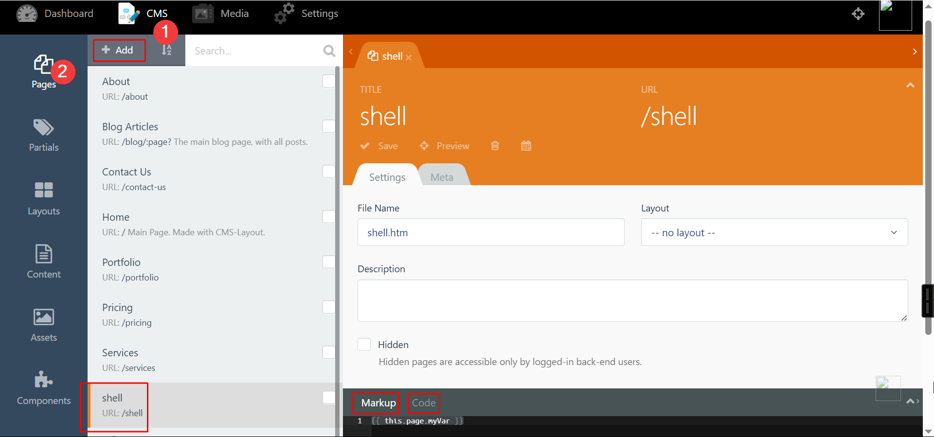 (1)导航到 CMS 编辑页面,并新增一个 shell 页面,同时对该页面设置相应的代码。